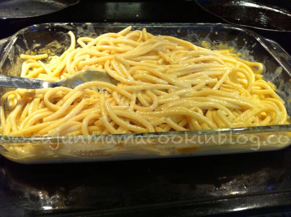 Cover the pan with foil  and put it  in your preheated oven.  Cook for about 30 minutes and then check it.  Remove foil and using a spoon, gently stir the noodles.  You want there to be some “juice” left.  Be careful not to let the noodles dry out because they will also dry up some once you take the dish out of the oven.  Usually about 30 minutes does it for me.  All of the cheese should be melted, but if not, giving it a good stir will help with that.  The milk mixture should be thicker than it was and clinging to the noodles.  If it is still runny, put the foil back on and bake it for another 5 or 10 minutes.
