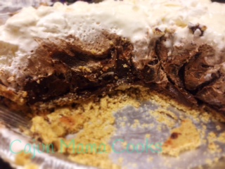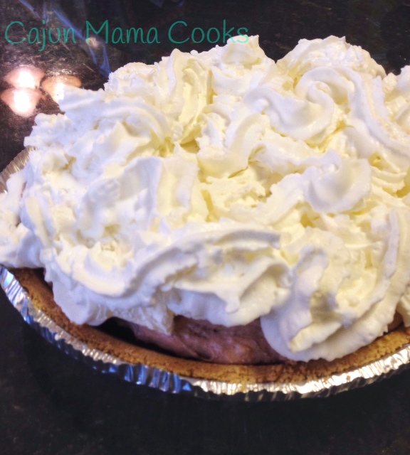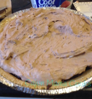 Now, in a medium size bowl, whisk together the pudding mix and the milk. Spoon 1 1/2 cups of this mixture into the pie crust. Now, mix 1/2 of the tub of Cool Whip with the rest of the pudding mixture. Stir to combine. Smooth this on top of the other layer. Top the pie with the remainder of the Cool Whip. Let this cool in the fridge for several hours or overnight. Enjoy the layers of lusciousness, my friends. And a shout to my good friend Betsy B. for this wonderful recipe she got from her cousin’s wife, Mandy!! Gotta love how good recipes get around!!