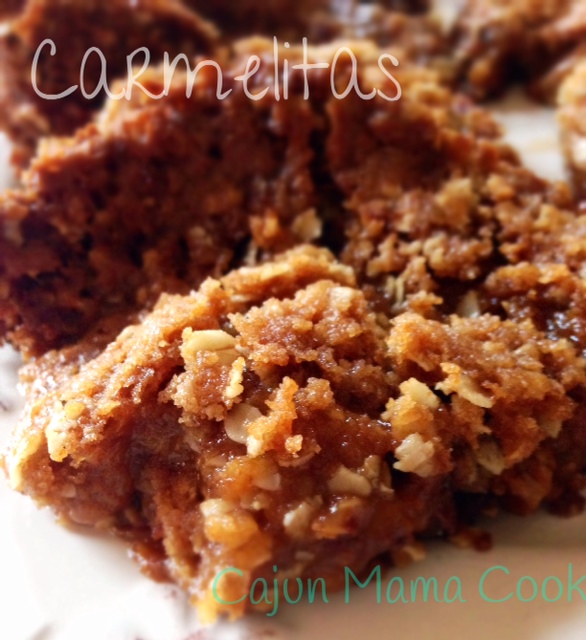 Preheat oven to 350 degrees.  Prepare an 8 x 8 inch baking dish by rubbing the bottom and sides with a stick of butter.  (not the whole stick ya’ll…just get some on the bottom and sides.  To be clear.  lol) Combine the heavy cream and caramel bits in a small saucepan over low heat.  Stir frequently until the caramels are completely melted and the mixture is completely smooth.  I stirred in the salt at this point.  Set aside (I kept the saucepan on my warming element on my stove to ensure it didn’t cool and get thick).  In a medium bowl, melt butter.  Next, stir in the brown sugar, flour, oats, and baking soda.  Press half of this mixture into your prepared baking dish.  Bake this for 10 minutes.  When you pull it out, sprinkle the chocolate chips over the baked layer.  Next, pour the warmed caramel sauce over the chocolate chips.  Finally, add dollops of the remaining butter/flour/oatmeal mixture on top of the caramel. It is hard to spread it.  I just kind of let it spread over the warm caramel naturally.  Then I flattened it as much as I could with a silicon spatula.  Pop this luscious concoction back into the oven.  Your kitchen will smell like heaven.  Let it bake for about 25 minutes.  Remove from oven and let cool completely.   Cut into squares and serve.  If you really want to be naughty (who doesn’t?) serve topped with some vanilla ice cream and a little drizzle of caramel topping.  Yeah…I said it.  I only mean if it is your birthday, your dog’s birthday, your aunt’s birthday, or if you made it through the day without cursing anyone out…only for occasions that call for a little celebrations.  I am all about celebrating small victories, ya’ll.  Or I am all about caramel sauce?  Either way.  You can address your thank you notes and notes of praise to Cajun Mama Cooks.  Just saying.