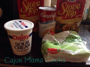 First of all, do not forget this…spray your crockpot with cooking spray. I forgot this part and now my crockpot is still soaking because so much stuff was stuck on it. Yuck. So yes, spray away friends. Next, lay your chicken breasts at the bottom of the crockpot. Now, sprinkle the two boxes of stuffing (dry) all over the chicken. Now, layer your still frozen green beans over the stuffing. In a medium bowl, whisk together the sour cream and soup. Pour this on top of green beans. Now take about a 1/2 cup of water and pour this over it all. Cook on low for about 6 hours. Halfway through, I gave the stuffing a nice fluff with a fork as suggested. This will over cook easily and your chicken will be a little dry so just kind of watch it. It was yummy and so warm and comforting!