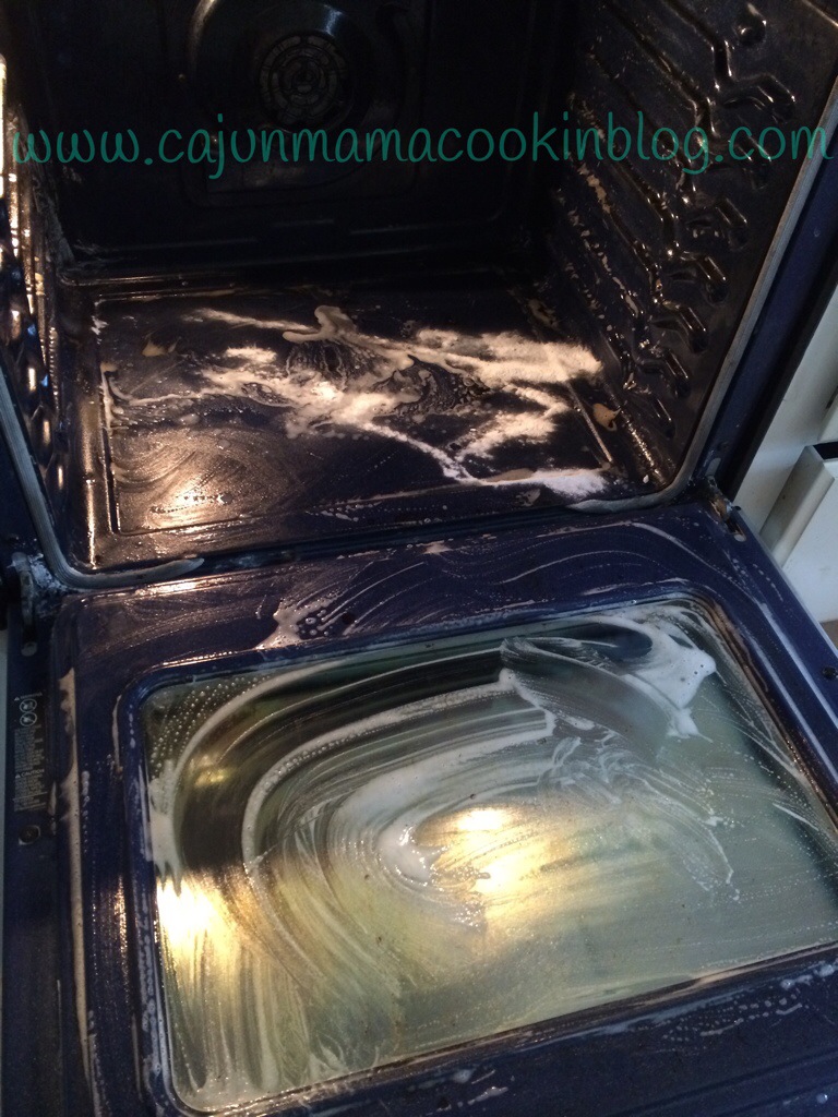 So I had just put the last batch of Pioneer Woman’s olive cheese bread…seriously like crack…it is addictive and it draws people to it like a cheesy savory magnet. Here is the recipe I had posted a while back…https://cajunmamacookinblog.com/2013/09/30/olive-cheese-bread/. It’s good stuff y’all. But a few minutes after I put the last batch in, my oven started to smoke. When you have 20 + people in your house, in your kitchen, that is a little alarming. Yeah…I knew then it was time to clean the oven again. It’s funny now and thank heavens the smoke alarm did not go off. Ha ha!! But really. So yesterday I spent much of the day wrangling my youngest monkey (he is a cute little mess) and putting the house back together after all the fun from the night before. Cajun mama and friends can get down now. lol! I am working on a post including all the recipes from that night. Anyway, this morning I woke up and decided it was time to get ‘er done as BD and every other Southern male says from time to time. I strongly dislike oven cleaner so I don’t even have it. I am pretty sure I lose brain cells every time I use that stuff and frankly, I have lost enough during my fast track to motherhood. I will keep the ones I have thanks so much. Thanks to Pinterest, my go to cleaning ingredients are blue Dawn, vinegar and baking soda. I found a post that told me kind of how to use these ingredients to clean the oven. Here is that linkhttp://www.couponingtodisney.com/homemade-oven-cleaner/. But I just looked at ratio of ingredients and got to it. In a big plastic glad ware container I combined about 1/2 cup baking soda, 1/2 cup vinegar and 1/2 cup dawn. Those are guesstimates. Just combine and add more of one or other until you have a paste like substance. It’s not an exact science and you can do this.
