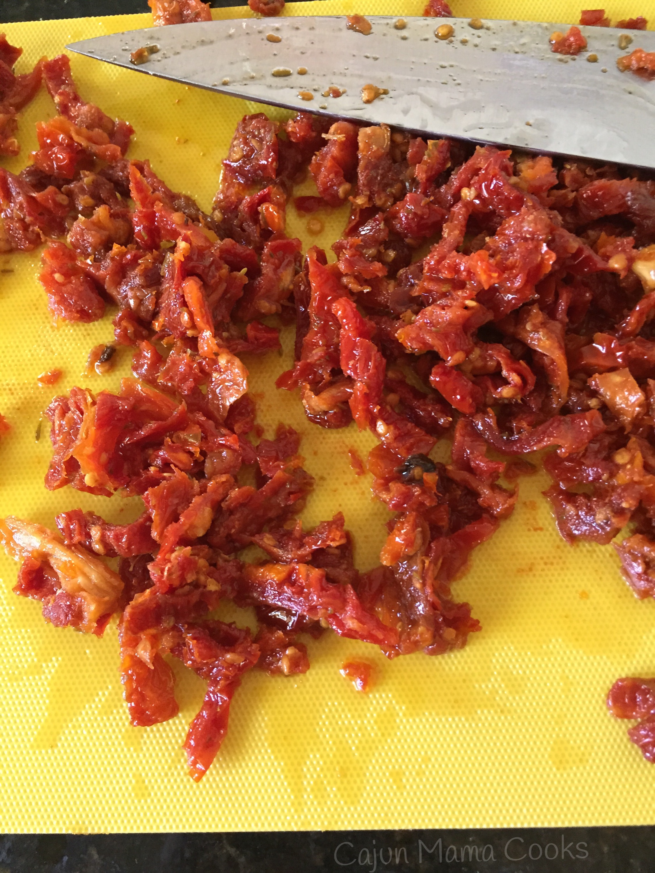 Drain oil from tomatoes and reserve. Give the sundried tomatoes what PW calls a “hard chop”. Does not have to be perfect or uniform just chop them up some.