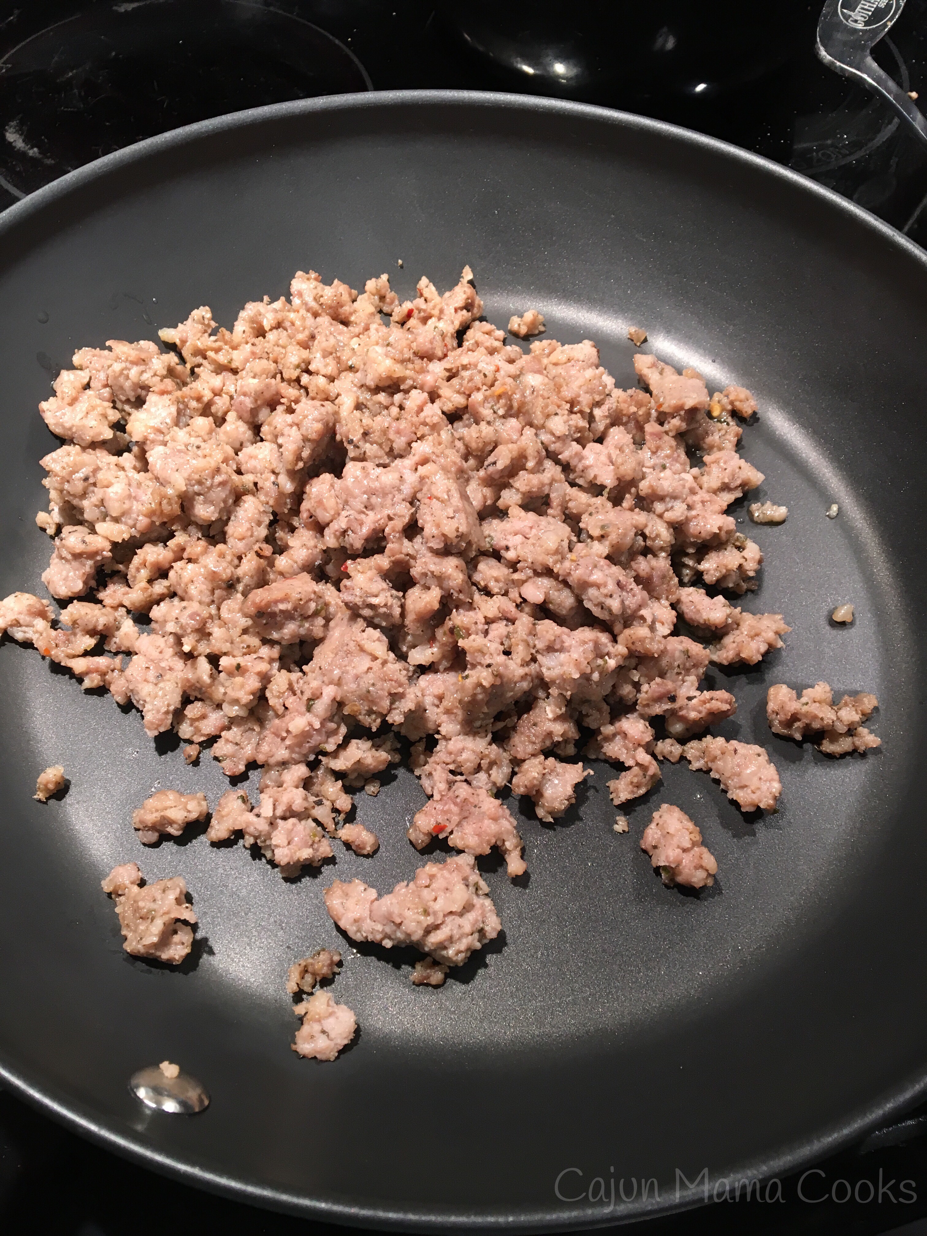 Start by browning the sausage in a skillet. It said do not drain but I did. Oops. It was fine. Set aside.