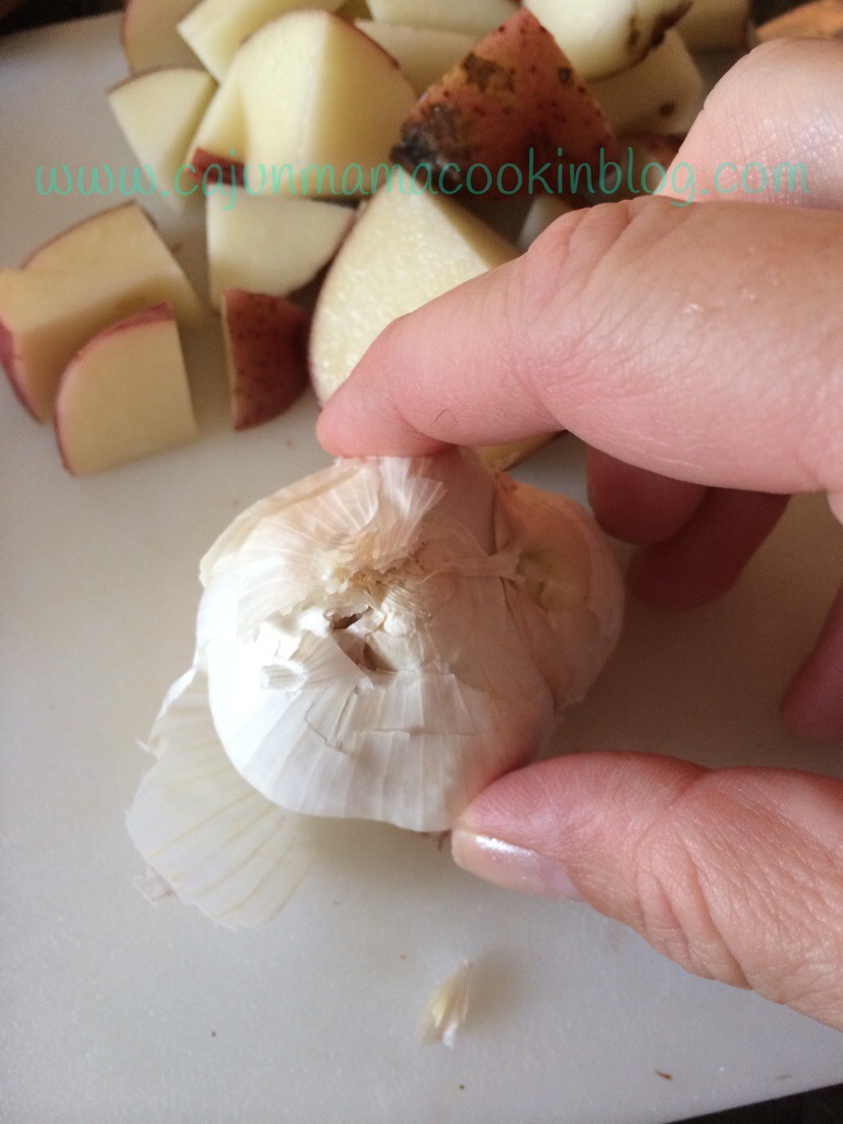 Layer the bacon slices at the bottom of a thick bottomed Dutch oven. You need one with a lid that fits nice and tight. I basically laid the bacon to cover the bottom one way and then laid slices across those slices the other way to fully cover the bottom. You will be amazed at how the bacon flavors this whole dish.