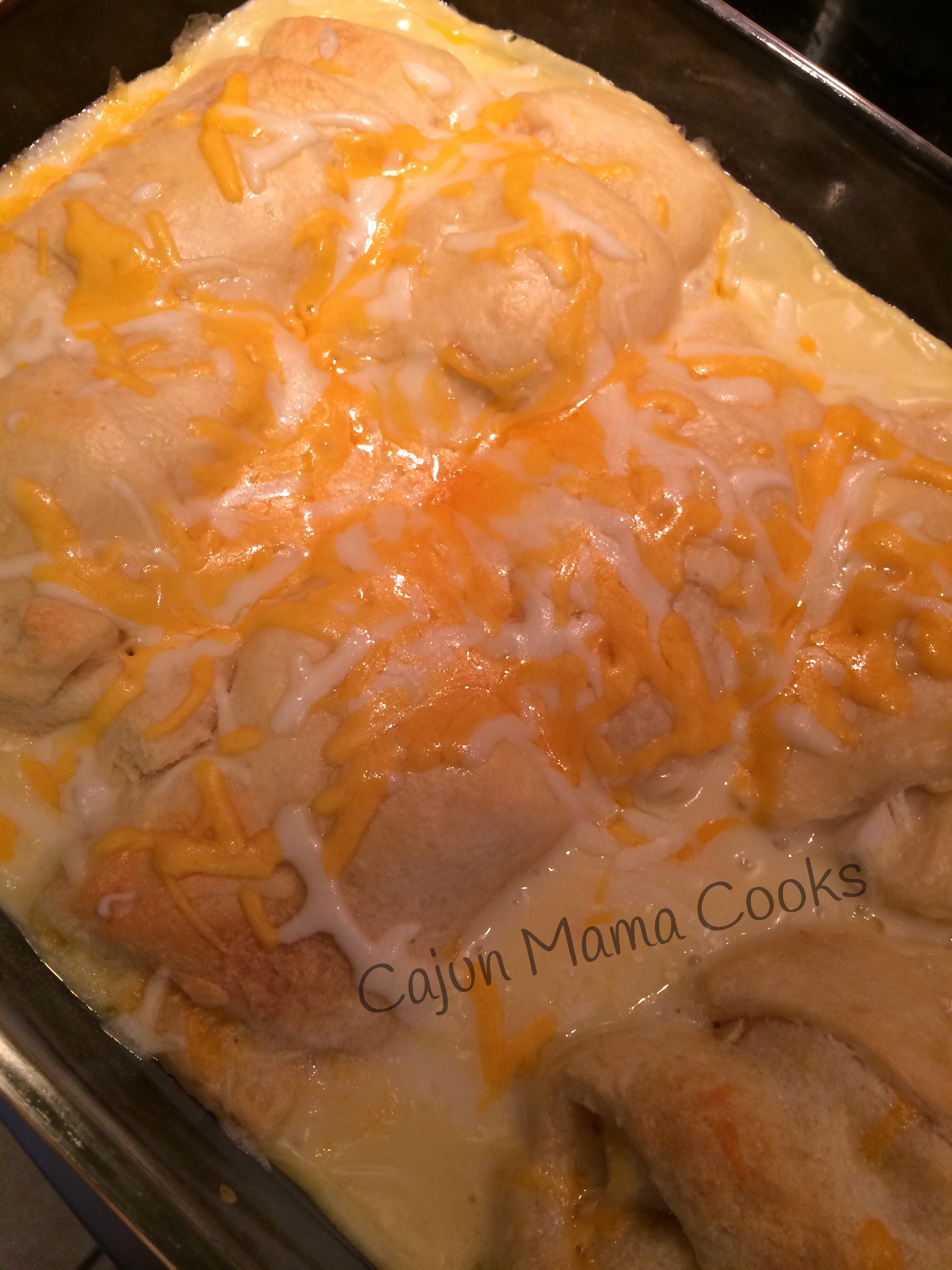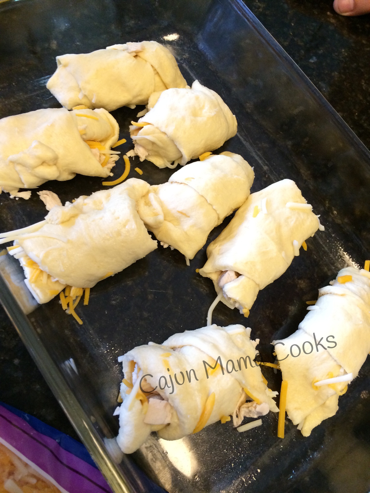 Cut up your cooked chicken. Roll out crescent rolls and separate them out. Now, take some chicken and place it in the largest part of the crescent triangle. Then top with some cheese. If I had to give you a guesstimate I would say about 1 tablespoon of each. Maybe a little less. Now, roll that bad boy up and place seam side down in your prepared dish. Do this for each crescent roll/square/triangle of dough what have you. In a medium size bowl, whisk together the can of soup and can of milk. Pour this over the pockets of yum.